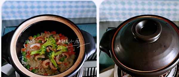 3、淘洗好的胚芽米倒入砂鍋裡,與三丁拌勻