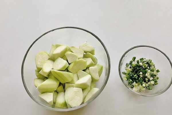 第二步,絲瓜去掉頂花和梗把,削去絲瓜外皮,將其洗凈切滾刀塊,香蔥洗凈切蔥末備用。