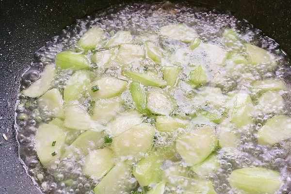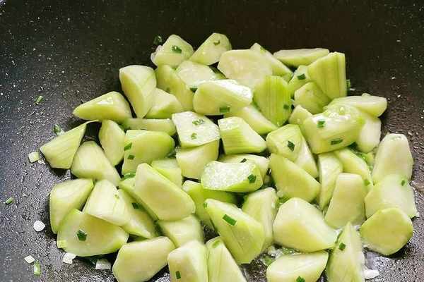 第三步,開火燒熱油鍋,倒油,燒至油溫5成熱,倒入香蔥末炒香,倒入絲瓜塊翻炒至變軟,絲瓜變軟後會出汁水,炒到這個程度即可。