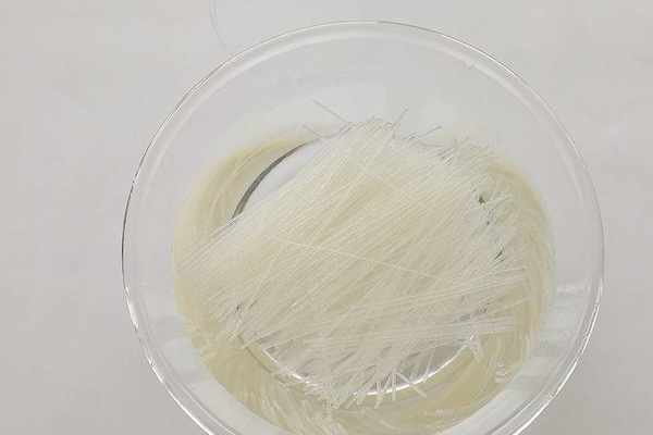 第一步,將水晶粉絲從中間剪成兩段,放入冷水裡浸泡到粉絲變軟,粉絲用來煮湯的話,不用泡太久,稍微煮一下就能食用,用冷水浸泡出來的口感會更好一些。