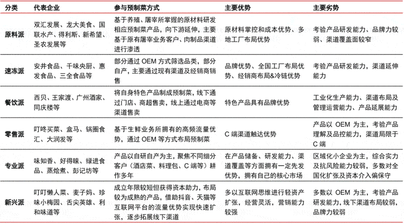 縱觀目前預制菜企業的類型,主要有原料派、速凍派、餐飲派、零售派、專業派以及新興派六大類型企業,它們參與預制菜的方式各不相同,同時又各有優劣。
