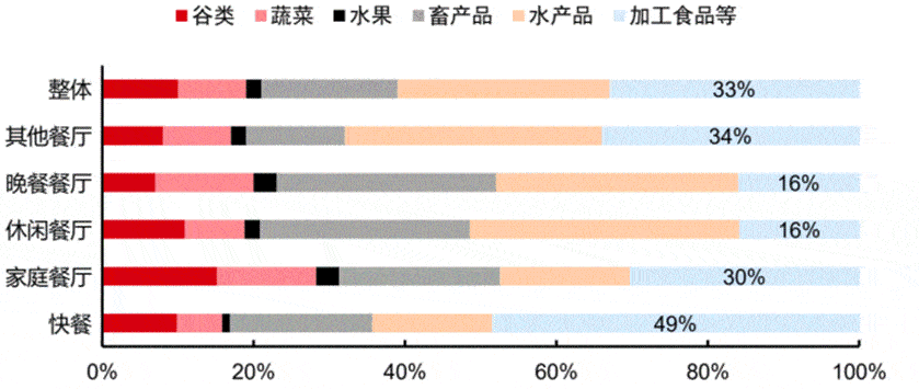 1998年之後,日本經濟開始往下走,餐飲規模回落,B端預制菜出現瞭量價齊落的現象,但最後依然實現瞭比較高的滲透率。從下圖可以看到,最右邊淺藍色部分為加工食品,也就是預制菜,它在整個餐飲業態中的采購成本占比,平均下來大概是33%。