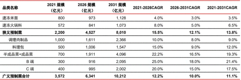 在銷售渠道方面,B端是預制菜目前的主要渠道,我們測算2021年預制菜在餐廳采購端的滲透率是12%左右,參考日本30%以上的滲透率,我們預計2031年中國預制菜在餐廳采購端的滲透率有望達到20%,滲透率的提升將驅動B端預制菜未來十年維持10%以上復合增速。