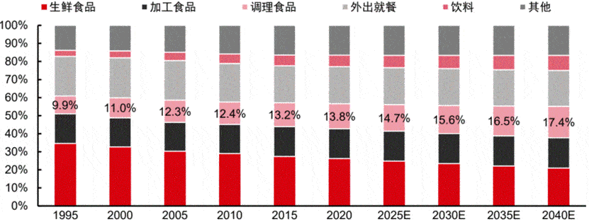 日本傢庭食品消費支出的構成數據也顯示,預制菜調理產品的消費占比在1995年約為10%,到2020年占比接近14%。而日本官方預測,未來這個數值會繼續提升,2040年日本傢庭對預制菜調理產品的消費占比會提升到17.4%。