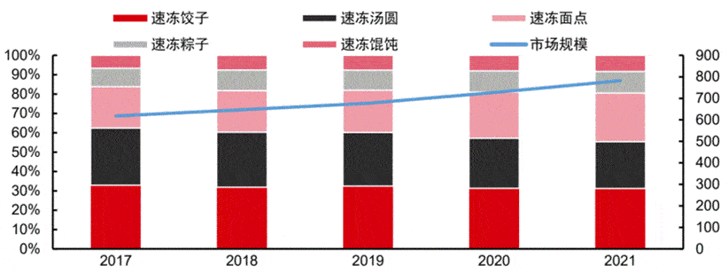 圖:速凍米面制品市場規模(億元)及細分品類占比