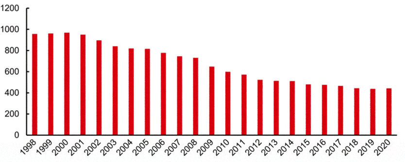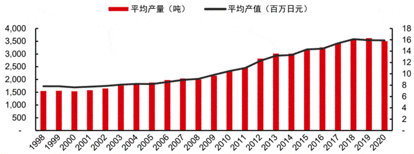 圖:日本冷凍食品單個工廠平均產量及平均產值變化