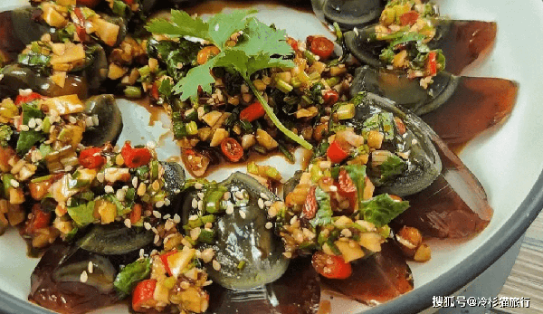 蔥拌皮蛋,是將皮蛋洗凈切成4瓣,放在盤子裡,再撒上豆瓣醬、鹽等調味料。雖然這道菜很美味,但因為它是一種醃制的食物,不能吃多。