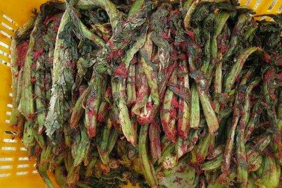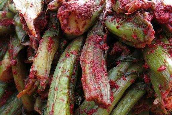 酸菜,在東南丘陵地帶食用的最多,大多都是用蓋菜配酒糟醃制而成,醃制兩月後,拿出洗凈,加五花肉,或煮酸菜魚,都是上等的選擇。最佳的酸菜材料是選,蓋菜去掉外面的菜葉,選蓋菜心做為醃制酸菜的原料。用酒糟醃制的酸菜,吃一次後就會難忘,在外面是不可能吃的到東南丘陵農村的這道美味瞭。