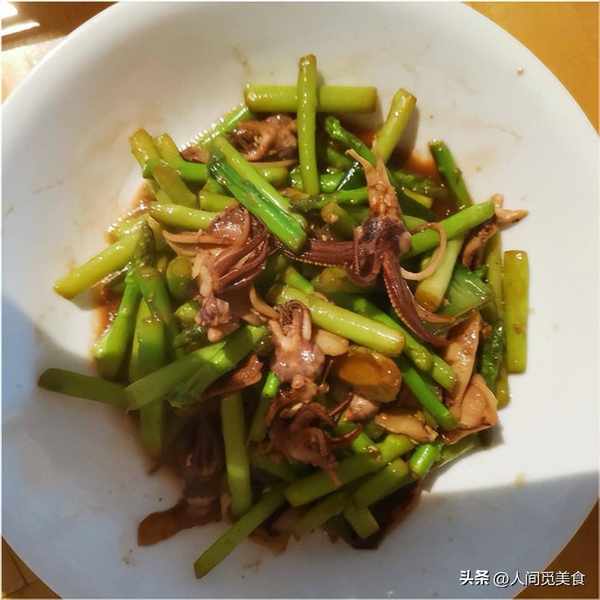 還有這個魷魚,口感也特別好,新鮮的魷魚去掉雜質清洗幹凈,和蘆筍一起翻炒,蘆筍本身很鮮甜,搭配Q彈入味的魷魚,味道更好,好吃而不膩,非常下飯。