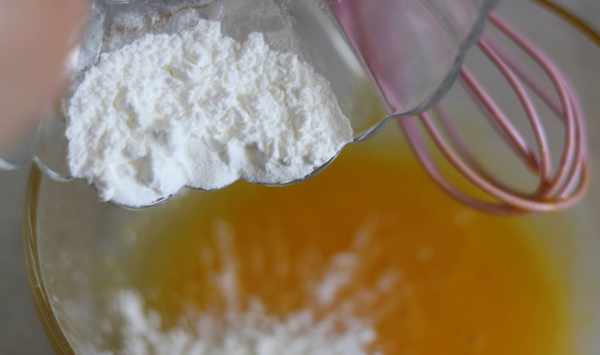 4、接下來制作,蛋黃糊。蛋黃中加入細砂糖,攪拌勻。倒入玉米淀粉。