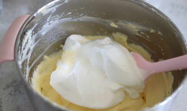 9、取約1/3的蛋白,和蛋黃奶酪糊翻拌均勻,再把拌好的蛋糕糊倒入到剩餘的蛋白中,繼續翻拌均勻。得到瞭細膩,無蛋白塊的細膩蛋糕糊。