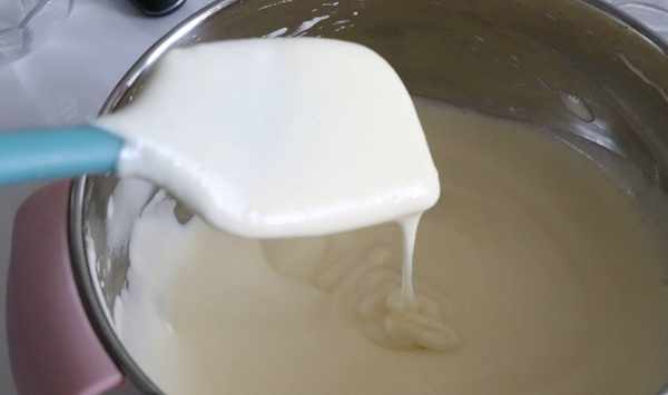 7、之後放到剛才燒熱水的小鍋上,隔熱水攪拌。隨著蛋糊的溫度升高,會逐漸變得濃稠。離開熱水,快速的攪拌到順滑的狀態。