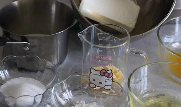 2、黃油隔熱水融化成液態,熱水溫度大約50度,就可以。奶油奶酪隔溫水軟化,攪拌均勻,順滑的狀態,不要過度的軟化。