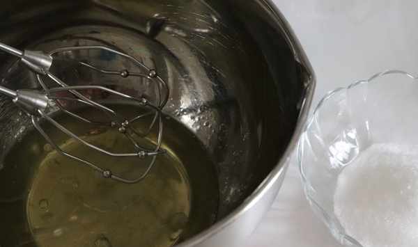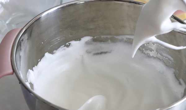 8、蛋白和戚風蛋糕一樣,分三次打發,但是這個蛋白不能打發到幹性狀態,打發到蛋白細膩有光澤,拉起打蛋器可以出現比較長的蛋白尾即可。