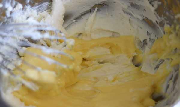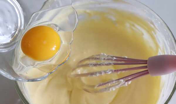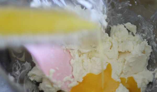 3、軟化好後的奶油奶酪,離開溫水,加入蛋黃,可以分3次加入,每加完之後都要攪打順滑,再加入剩餘的。加完所有蛋黃攪勻後,加入牛奶混勻。