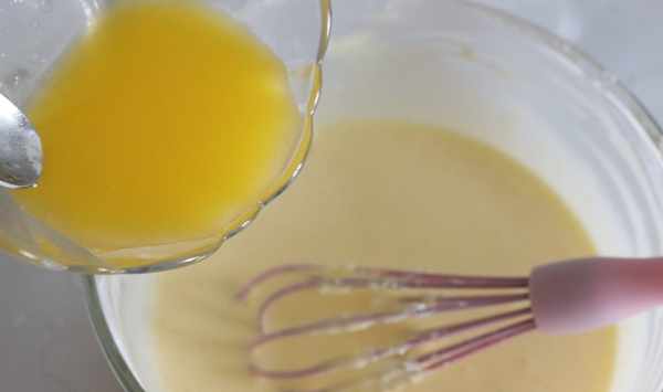 8、做好的蛋糊,倒入奶酪糊中,用手動打蛋器,攪勻。