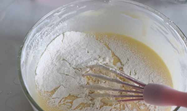 5、篩入低筋面粉,畫Z字拌到無幹粉狀態。不用過度的攪拌。