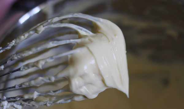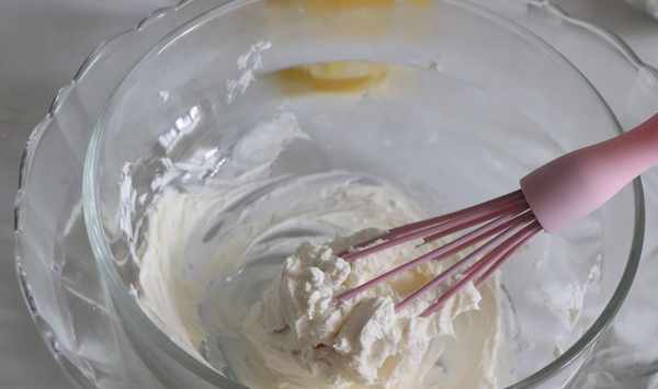 11、把之前做好的奶酪糊,再用手動打蛋器攪拌幾下恢復到順滑狀態。