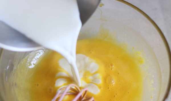 6、把配方中的牛奶煮沸,並且再煮沸一鍋開水。牛奶煮好後,慢慢的倒入蛋黃糊中,一邊倒一邊拌勻。