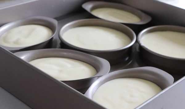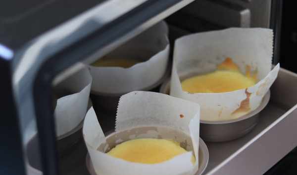 10、倒入模具中,我用的是迷你模具,一般放入模具大約8-9分滿。放入一個深一點的烤盤中,註入50度左右的溫水,水位大約沒過模具1厘米高。