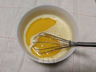 2.倒入米糠油,攪拌均勻,直到油和雞蛋的混合物混合。