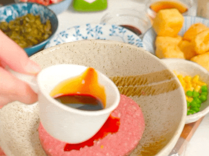 拆開一包牛肉餅,加入1瓷勺料酒、1瓷勺生抽、1小勺糖,抓勻均勻調味。