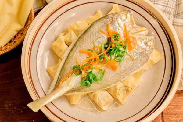 盤子裡擺上包好的千張包,再放上一條黃魚鯗。