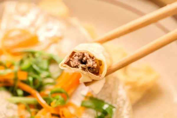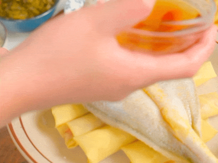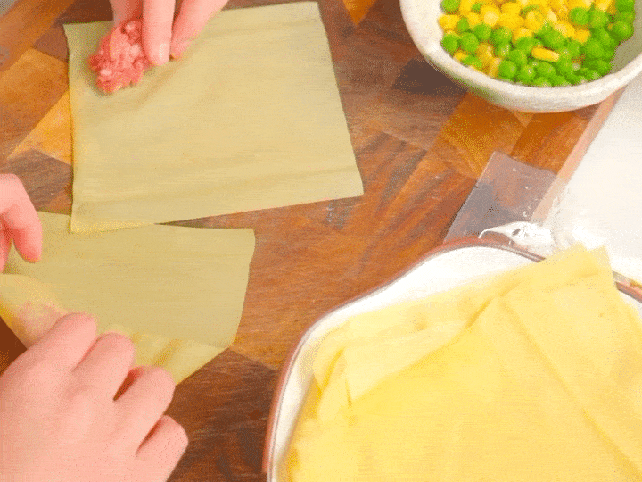 將肉餡包入千張中,肉不用放太多,註意兩邊要包緊一些。