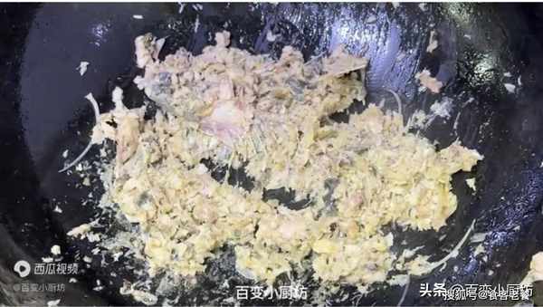 翻過來之後,將另一面也煎至微黃,煎至定型。兩面都煎好後,我們現在用鏟子將魚打散,直接用鍋鏟或者是勺子將它打碎,充分打碎之後,我們再翻炒一下,把魚的香味炒出來。