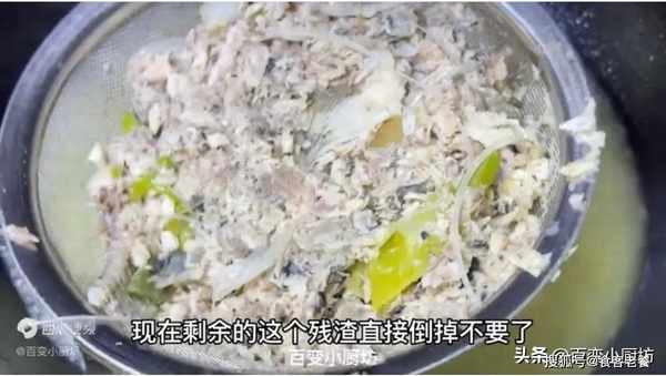 然後用勺子按壓一下,把裡面的魚湯擠壓出來。魚肉裡面的營養成分已經完全的註入到湯汁裡面去瞭,現在剩餘的這個殘渣直接倒掉不要瞭,以防萬一。