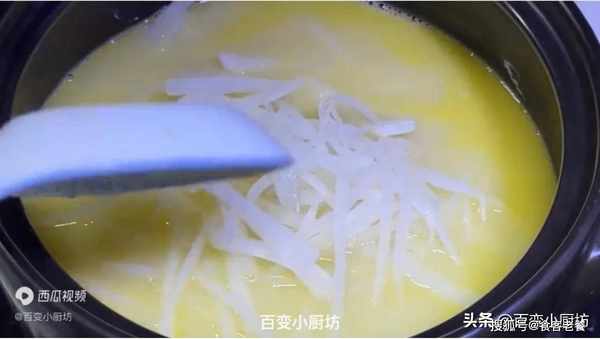 可以看到這個湯色非常的奶白,看起來就像牛奶一樣,現在把焯好水的蘿卜絲倒進魚湯裡攪拌兩下。