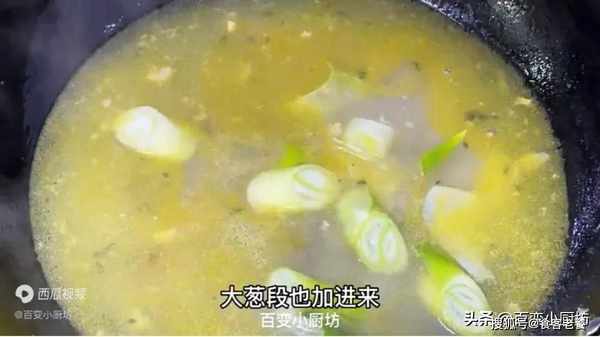把拍碎的生薑塊放入,倒鯽魚湯裡,大蔥段也攪進來,用勺子攪拌攪拌。