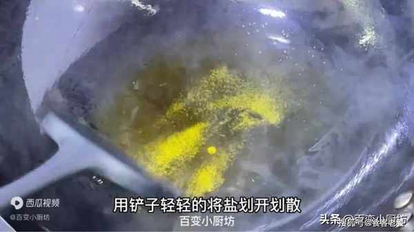 塗抹好之後,現在我們熱鍋燒油,鍋中放少許植物油,加一勺鹽,把火調到最小,用鏟子輕輕的將鹽劃開,劃散,加一點鹽,這樣子我們在煎魚的時候就不容易出現粘鍋的現象,可以有效防止把魚煎糊。
