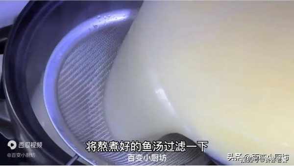 這個時候鍋裡面的鯽魚湯也熬的差不多瞭,可以看一下,現在湯就非常的白瞭,我們現在把裡面的魚渣子打撈出來。