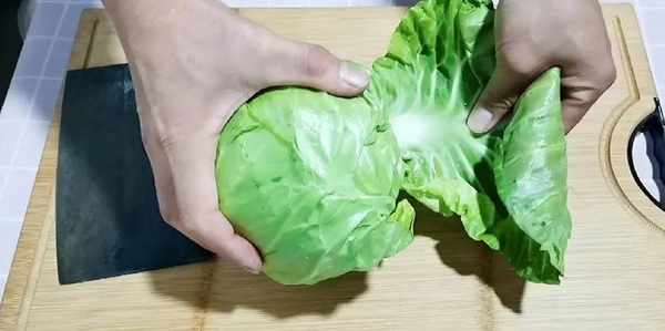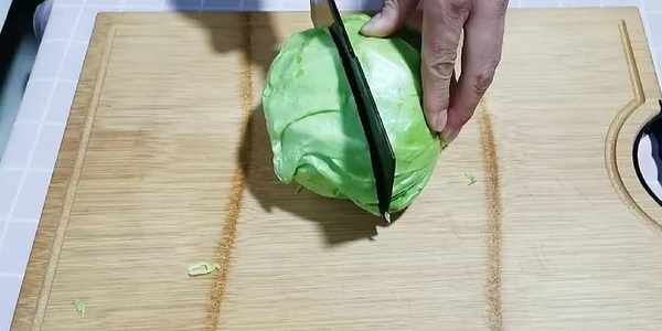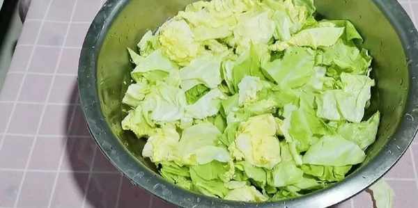 步驟:1.包菜先用刀拍幾下(這樣做包菜葉比較容易剝下來),剝去外面的子不要,從中間把包菜切成兩半,然後把包菜的老根切掉,用手把包菜撕成小塊,用清水浸泡5分鐘後清洗幹凈撈出控水備用(包菜一定要清洗,因為包菜生長過程中會噴灑農藥,而且噴藥不及時還會有小蟲子)。