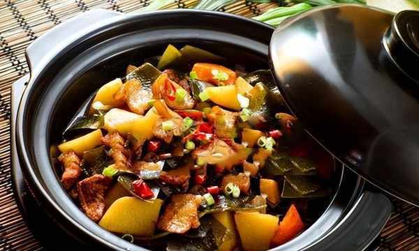 1. 海帶提前半天泡開。土豆洗凈去皮切大塊,五花肉切塊;