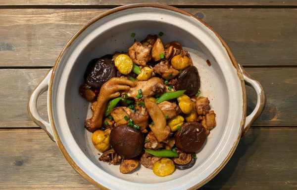 3、倒入適量生抽、老抽、料酒,翻炒上色後倒入板栗仁、香菇,大火翻炒均勻,加入適量食鹽、白糖、雞精,加適量清水煮開,中小火燜熟10分鐘,放入青椒大火收汁,撒上蔥花即可出鍋。