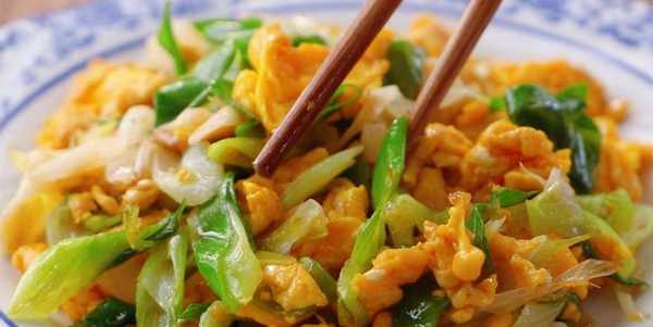 1、大蔥剝洗幹凈,斜刀切片。雞蛋打入碗中,加適量鹽打散。起鍋燒油,八成熱時放入雞蛋液,大火煎至定型,炒成大塊後盛出。