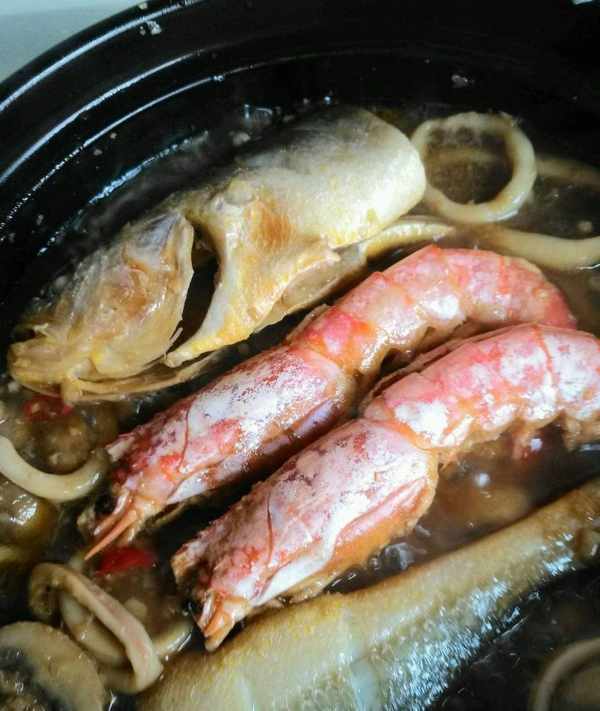 第四步,快速將醃制好的鱸魚擺放砂鍋中,洋蔥和蔥薑蒜墊鍋底,鱸魚擺在上面,再將鮮蝦擺放在上面,青紅辣椒丁撒在上面,撒上少許食用油,同時淋上較多點的蒸魚豆豉油,蓋上砂鍋蓋,大火煮,煮開,轉為中小火燉上幾分鐘,一般控制在5~10分鐘之間即可,出鍋前撒上少許香菜葉。