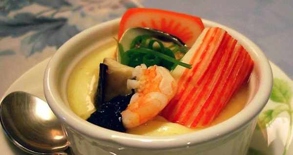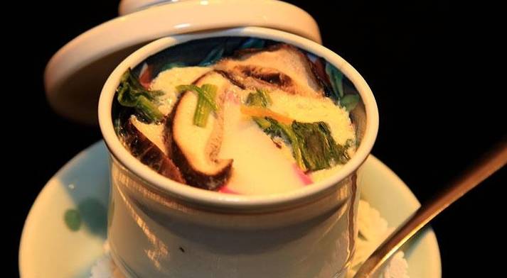材料有:雞蛋、雞胸肉、烤鰻(隻能用海鰻Anago,不可用河鰻Unagi)、蝦、日式魚餅Kamaboko、銀杏、冬菇、鮮百合、三葉和柚子皮。淡醬油和出汁Dashi,那是一種從木頭魚和昆佈熬出來的湯,要用一番出汁。