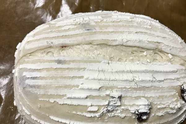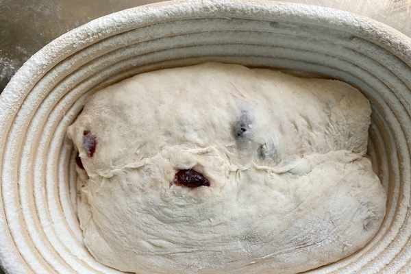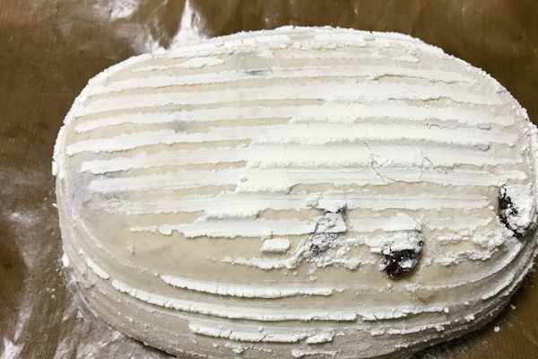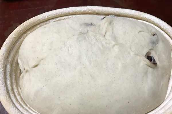 然後把面團折疊排氣收口朝上,放入提前篩好面粉的藤籃中