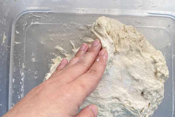 之後加入鹽采取從外向內折疊手法,將面團折疊80-100次