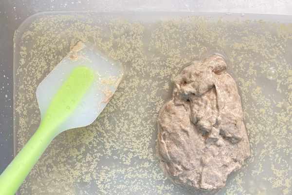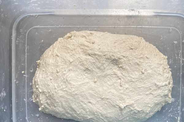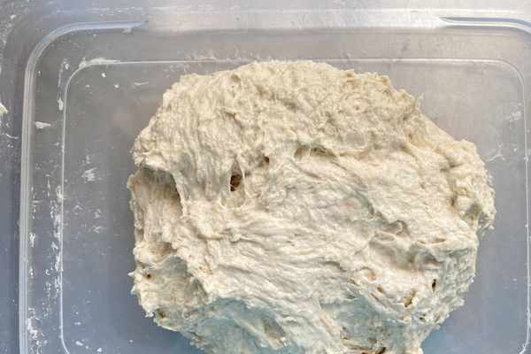這樣將鹽和面團混合好,然後室溫發酵半個小時。然後開始給面團排氣,每30分鐘用折疊手法,每次折疊5-6下,給面團排氣,一共排氣2次(或者10分鐘/次排氣,一共排氣5次)。