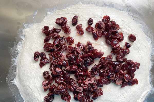 之後加入酒浸蔓越莓,將面團用翻折的手法,把蔓越莓幹和面團混合均勻