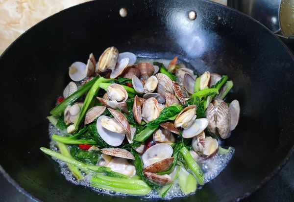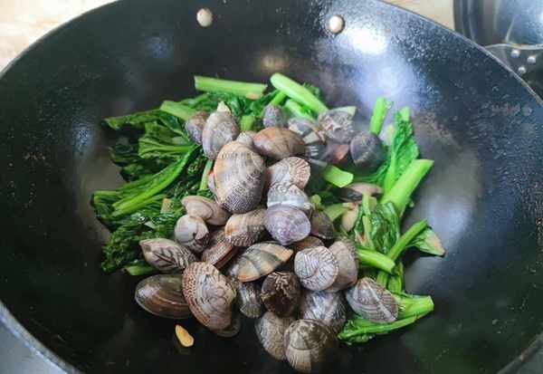 3.鍋中下入洗凈的蛤蜊,跟小白菜一起翻炒均勻,添入適量的清水。