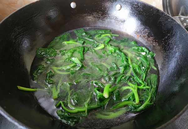 2.鍋中入油爆香蔥薑末,下入木耳菜翻炒均勻,炒至木耳菜變軟出水後烹入料酒後添湯。