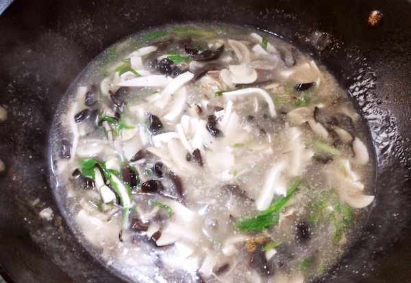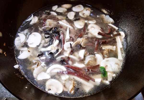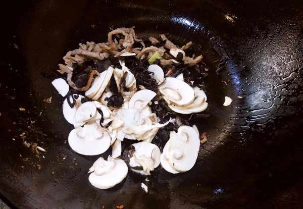 2.鍋中入油爆香蔥薑蒜,下入肉絲翻炒均勻,炒至肉絲變色後下入口蘑和木耳肉絲翻炒均勻,烹入料酒和一品鮮醬油後添湯。