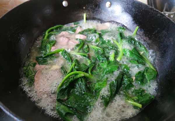 3.鍋中湯汁大火燒開後轉小火,把醃制好的豬肝逐片入鍋,豬肝全部入鍋後用手勺輕輕推散。