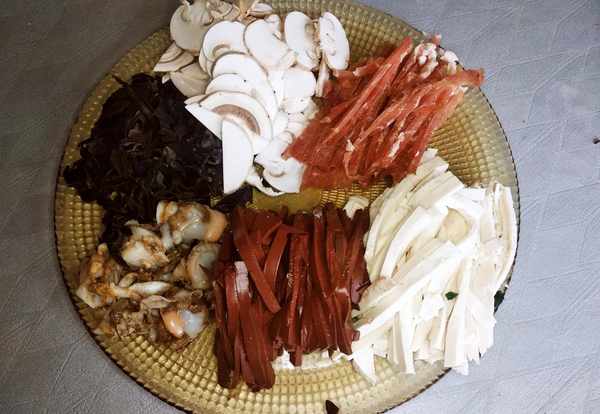 1.豬裡脊肉切成細絲,口蘑洗凈後切成片,木耳泡發後摘洗幹凈切成細絲,血豆腐和鹵水豆腐分別切成粗絲,煮熟的扇貝肉去除內臟備用。