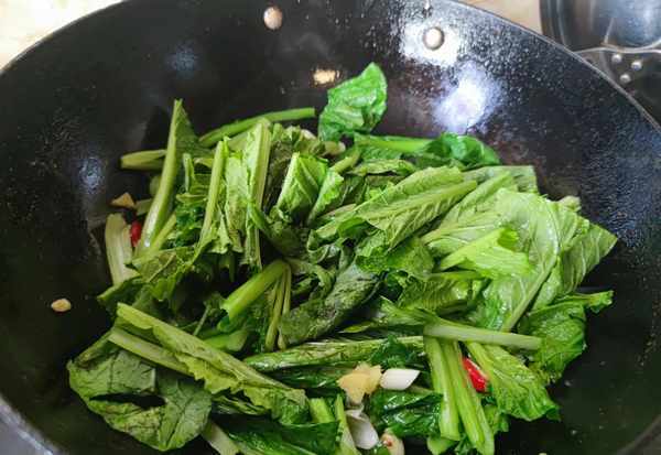 2.鍋中入油爆香蔥薑蒜和幹辣椒,下入小白菜翻炒至變軟出水,烹入料酒。